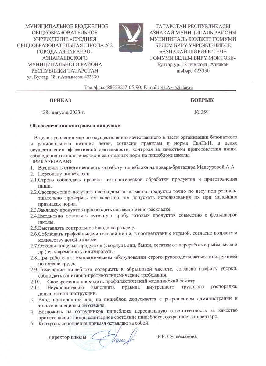 Приказ МБОУ "СОШ №2 г.Азнакаево" от 28.08.2023г. №359 "Об обеспечении контроля в пищеблоке"