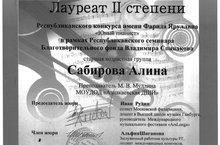 Ученица 7а класса Сабирова Алина удостоилась диплома лауреата 2 степени Республиканского конкурса имени Фарида Яруллина "Юный пианист" в старшей возрастной группе. Мы поздравляем Алину, её родителей и преподавателя школы искусств Муллину М.В. и желаем дальнейших творческих успехов.