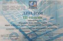 Ученица МБОУ "СОШ с.Чалпы" Азнакаевского муниципального района РТ Шарафиева Залия в рамках деятельности на базе центра "Точка роста" завовала 3-место на Республиканском турнире «Компьютерная грамотность» посвященного первого полета человека в космос в номинации «Компьютерная грамотность».