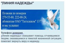 «Линия надежды» оказывает помощь отчаявшимся людям, оказавшимся в тяжелой жизненной ситуации, помогает вернуть веру и надежду.«Линия надежды»- единственная в Республики Татарстан медицинская психологическая служба: