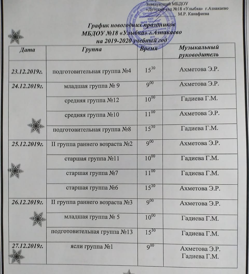 24.12.19. Младшая группа № 9 в 09.00 Муз.рук.Ахметова Э.Р.Средняя группа № 12. в 10.00 Муз.рук. Гадиева Г.М.Средняя группа № 10 в 11.00 Муз.рук. Ахметова Э.Р.Подготовительная группа № 8 в 15.30 Муз.рук Гадиева Г.М.25.12.19. 2 группа раннего возраста № 2 в 09.00 Муз.рук. Ахметова Э.Р.Старшая группа № 11 в 10.00 Муз.рук. Гадиева Г.М.Старшая группа № 7 в 11.00 Муз.рук. Гадиева Г.М.Старшая группа № 6 в 15.30 Муз.рук. Ахметова Э.Р.26.12.19 2 группа раннего возраста № 3 в 09.00 Муз.рук. Ахметова Э.Р.Младшая группа № 5 в 10.00. Муз.рук. Гадиева Г.М.Подготовительная группа № 13 в 15.30 Муз.рук Гадиева Г.М27.12.19. Ясли группа в 09.00 Муз.рук. Ахметова Э.Р. Гадиева Г.М. -