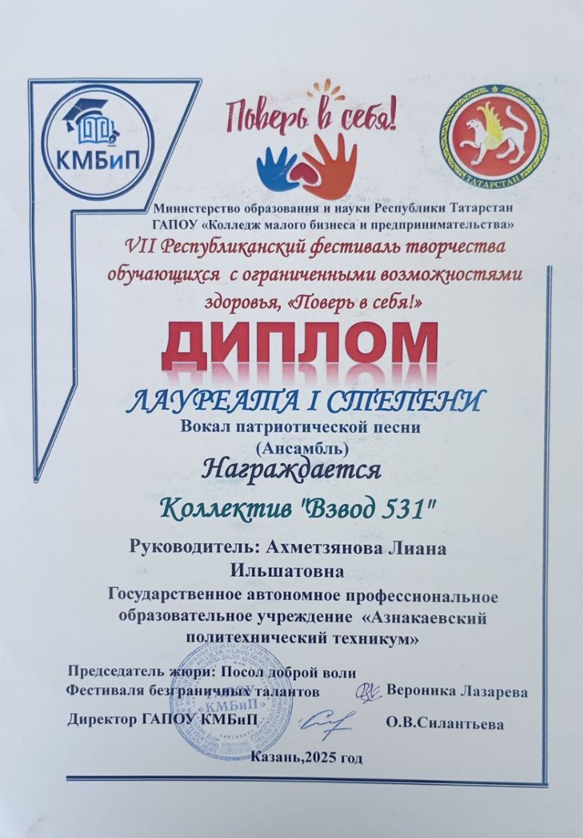 Вокальный коллектив техникума "Взвод 531", под руководством педагога-организатора Ахметзяновой Л. И., получил диплом Лауреата I степени.