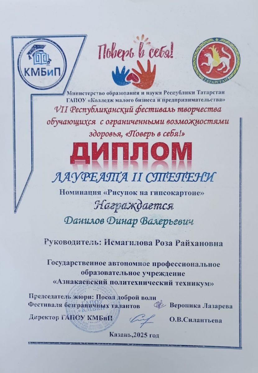 Наш обучающийся Данилов Динар, под руководством мастера производственного обучения Исмагиловой Р.Р., в номинации "Рисунок на гипсокартоне" получил диплом Лауреата II степени.