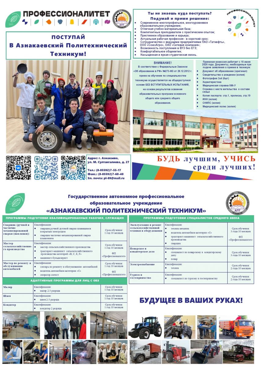 Государственное автономное профессиональное образовательное учреждение «Азнакаевский политехнический техникум» / дәүләт автоном һөнәри белем бирү учреждениесе "Азнакай политехника техникумы"