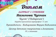 03.01.2022 Учащаяся объединения "Мирас" стала лауреатом 1 степени на Всероссийском фестивале искусств "Подарочек" (педагог Кадырмаева Ф.К.) 10.01.2022