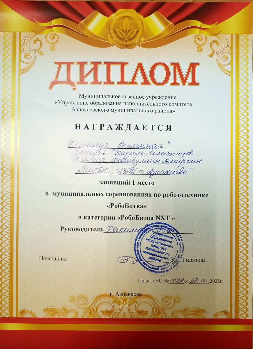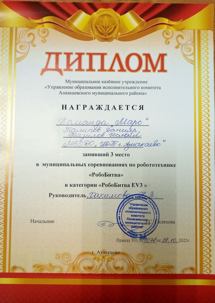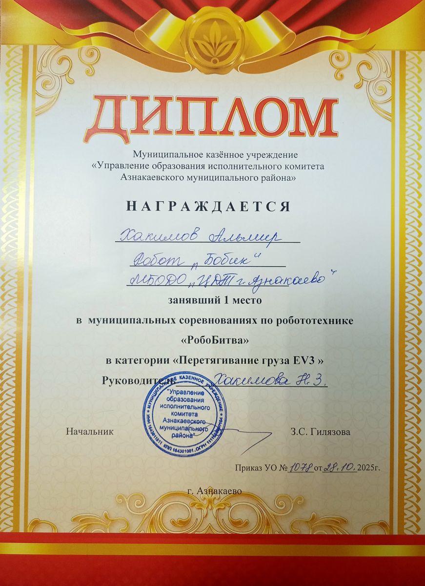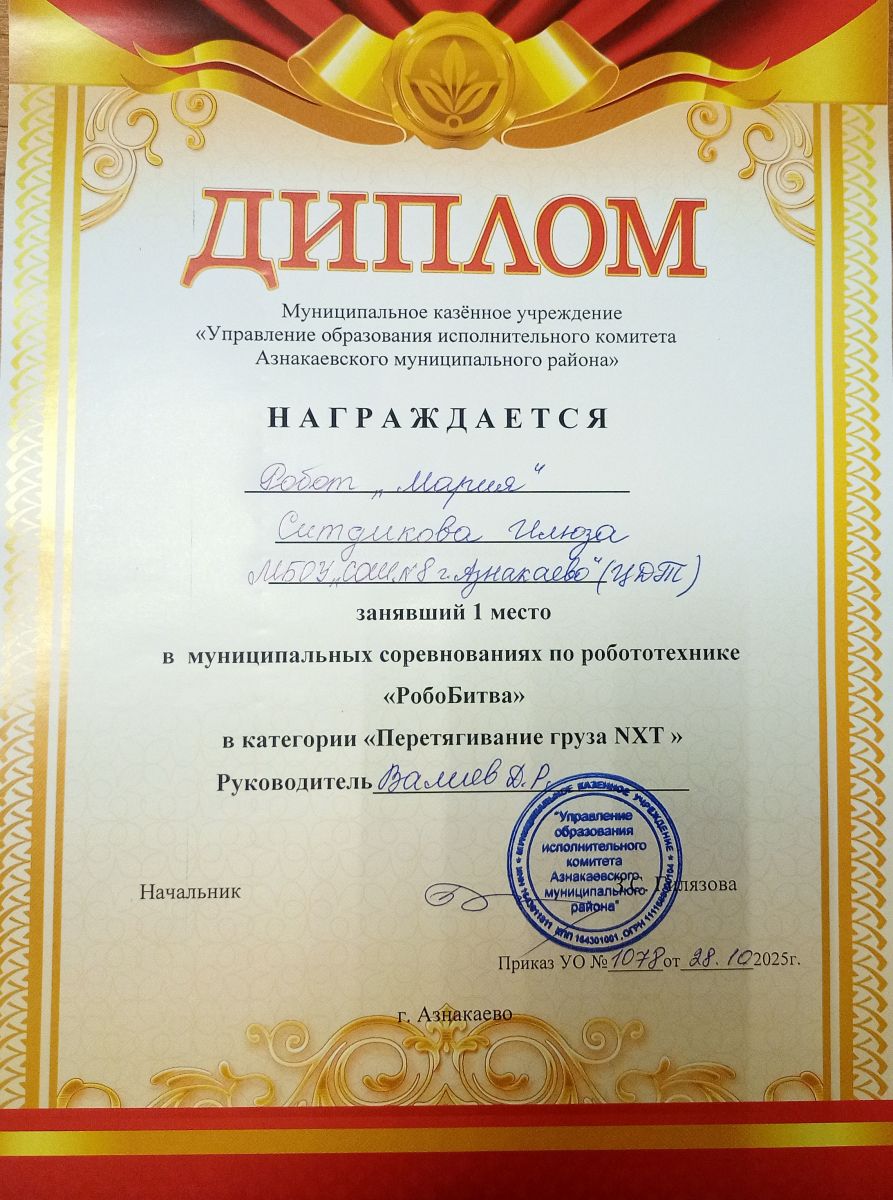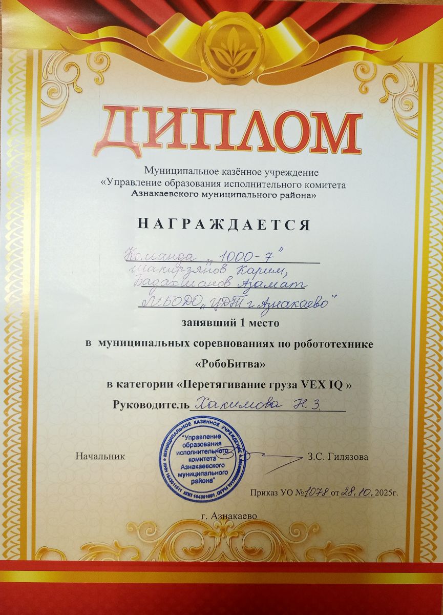 1 место в муниципальных соревнованиях по робототехнике "Робобитва" (Команда "1000-7", Хакимова Н.З.)