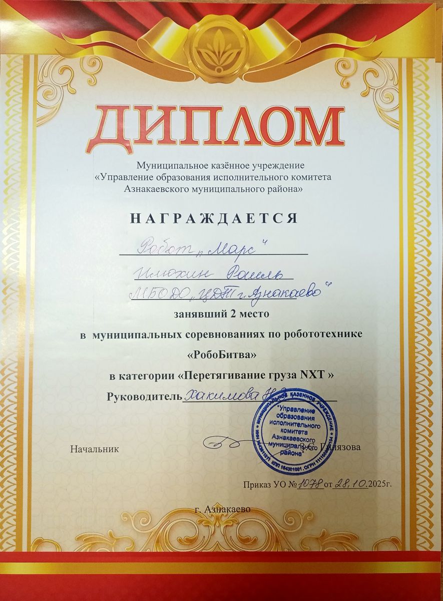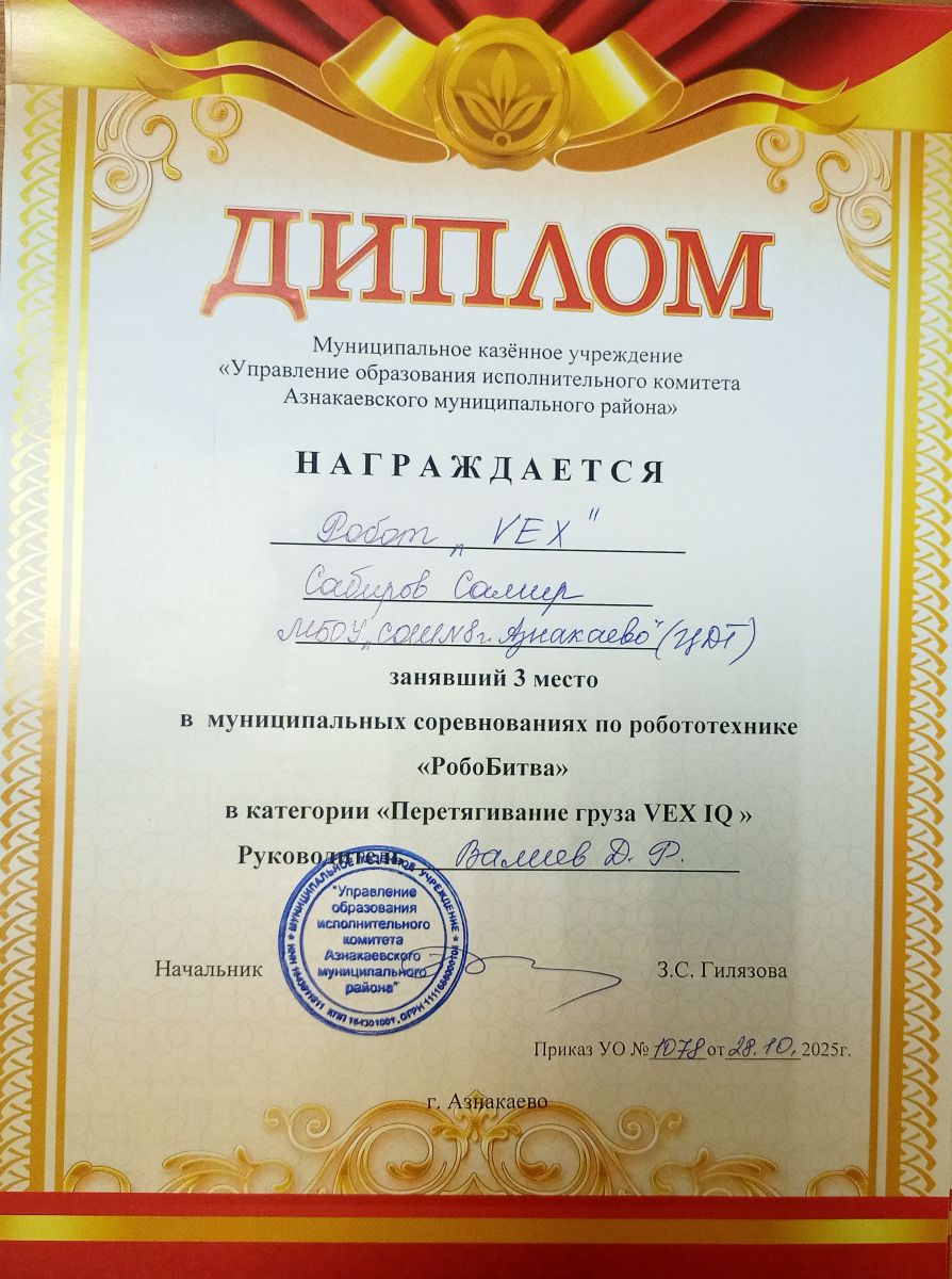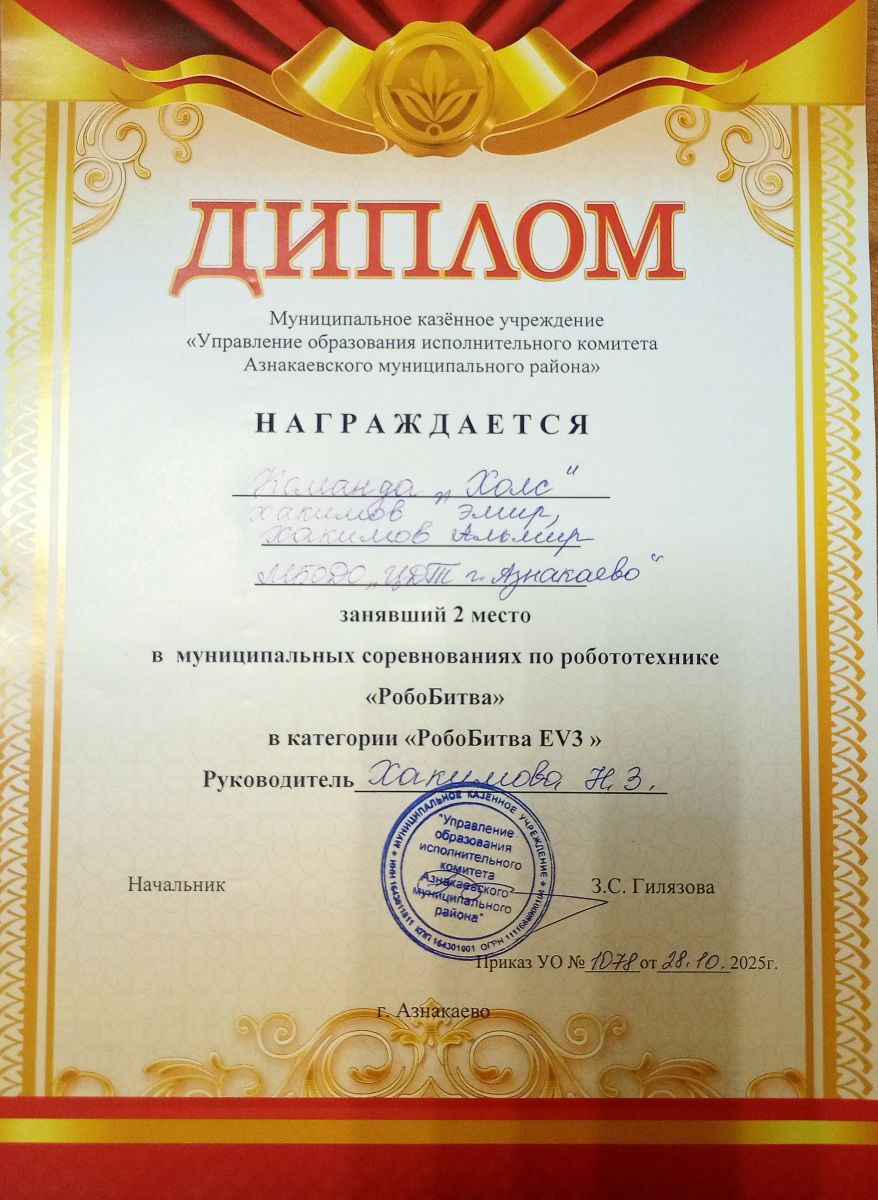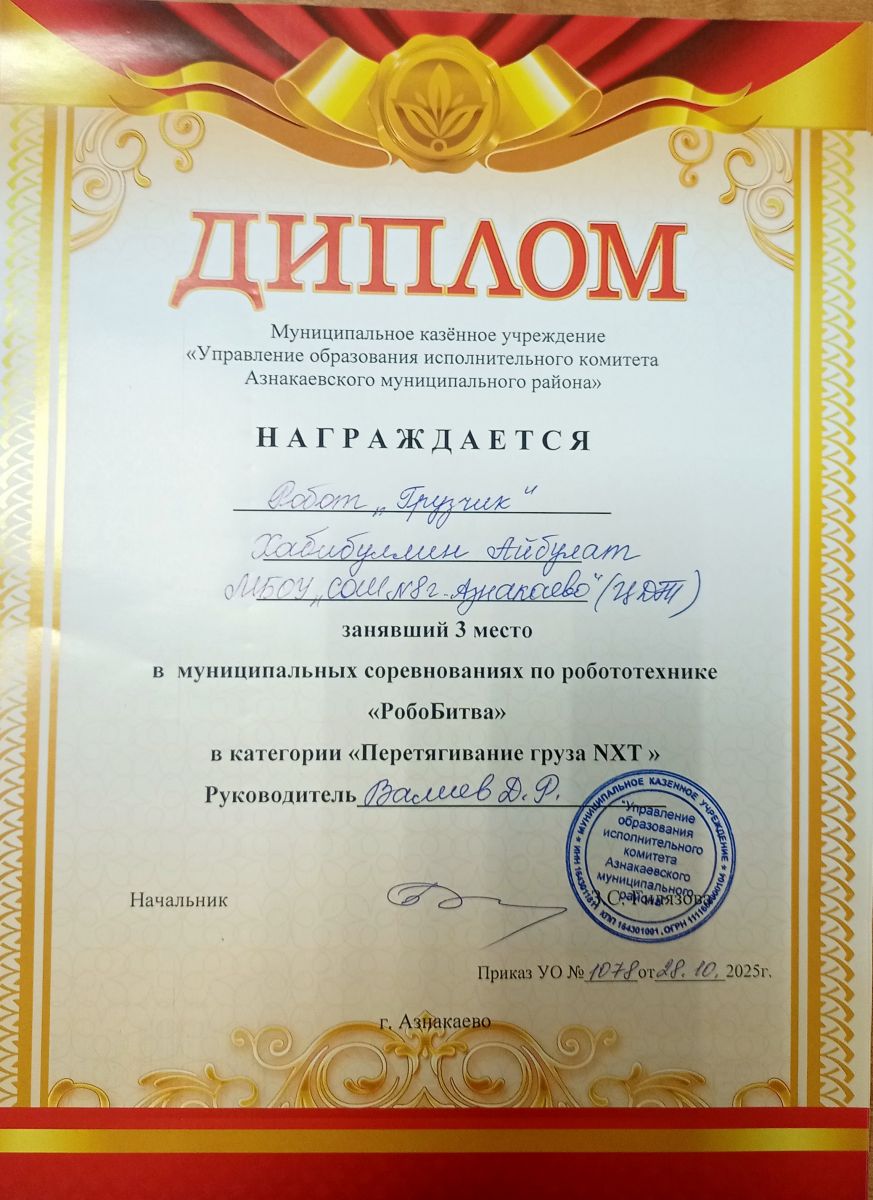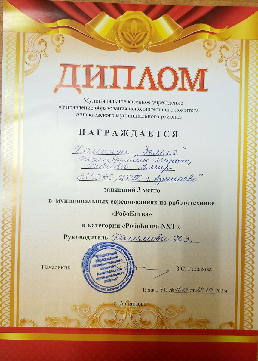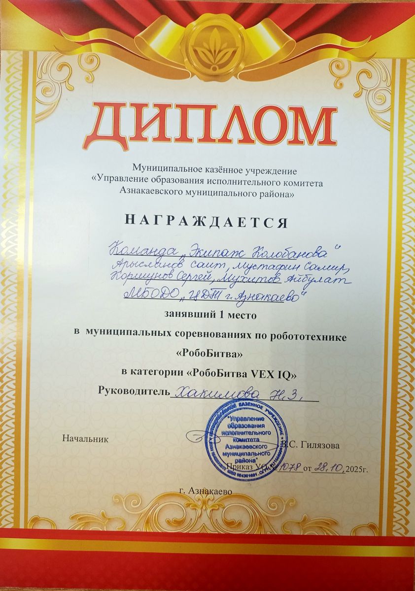 1 место в муниципальных соревнованиях по робототехнике "Робобитва" (Команда "1000-7", Хакимова Н.З.)