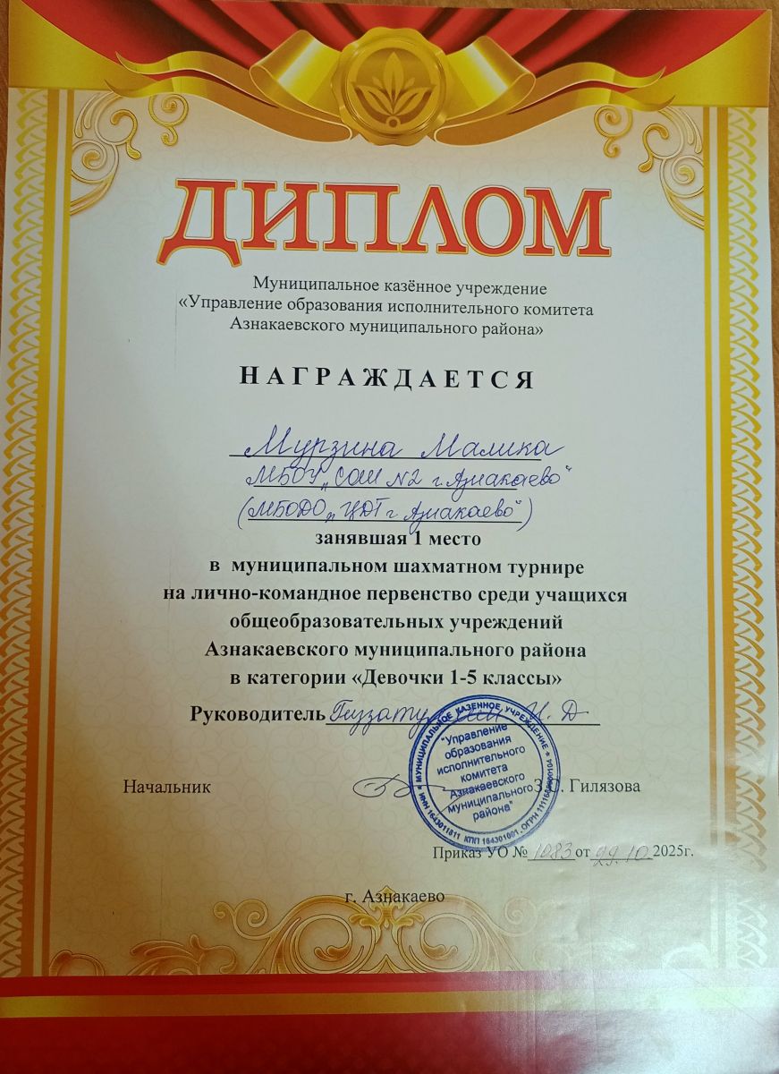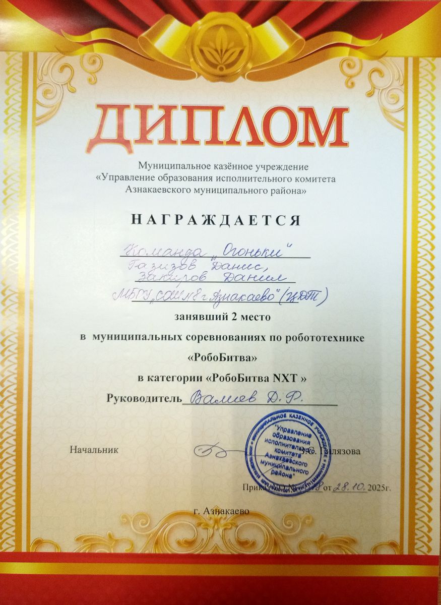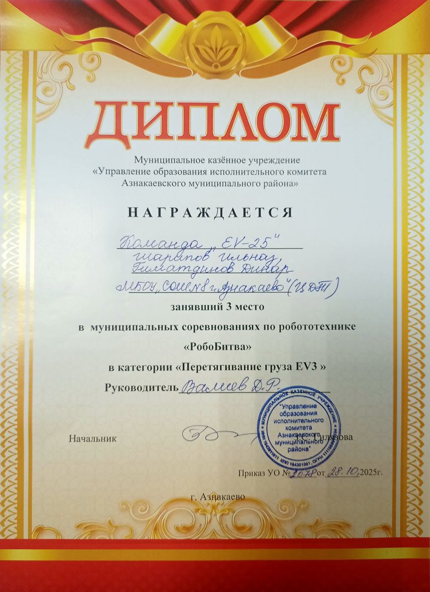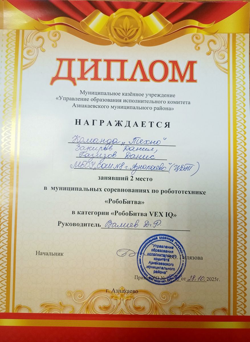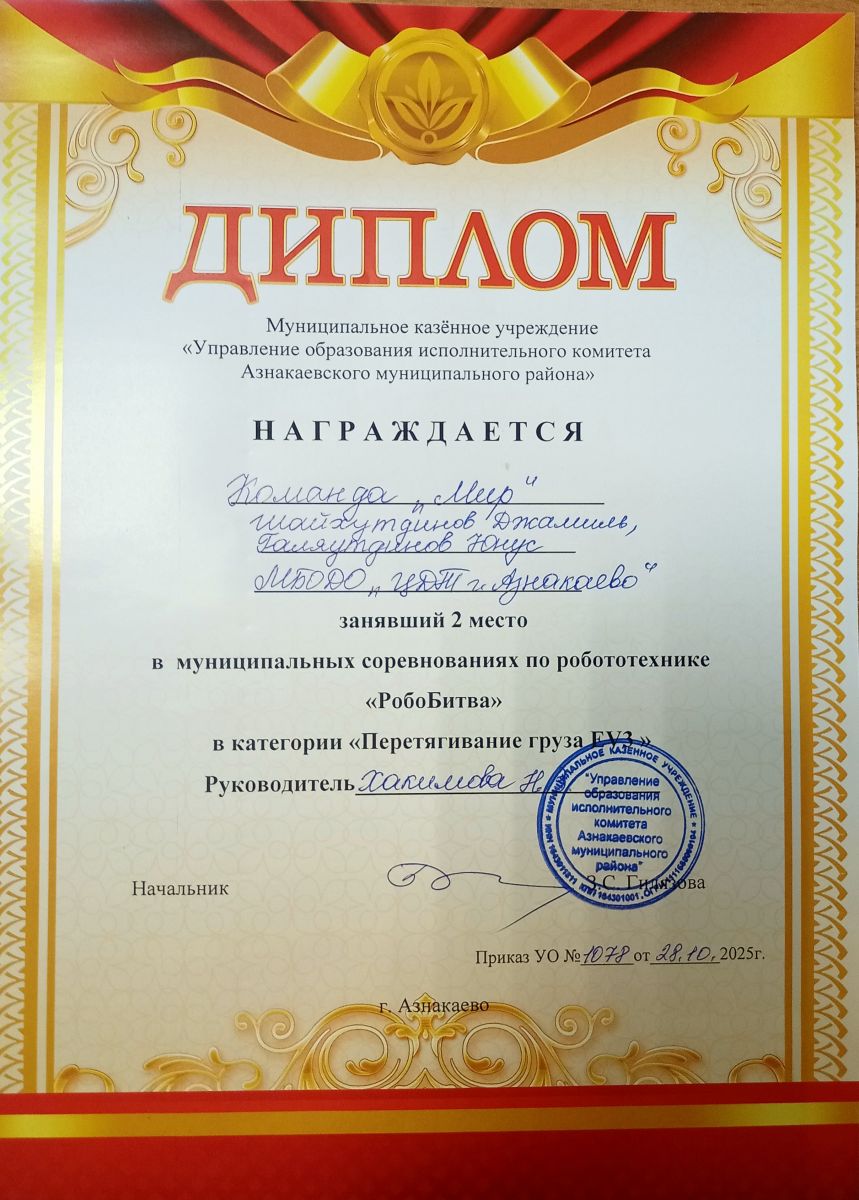 1 место в муниципальных соревнованиях по робототехнике "Робобитва" (Команда "1000-7", Хакимова Н.З.)