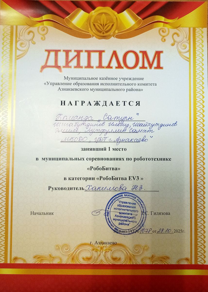 1 место в муниципальных соревнованиях по робототехнике "Робобитва" (Команда "Сатурн", Хакимова Н.З.)