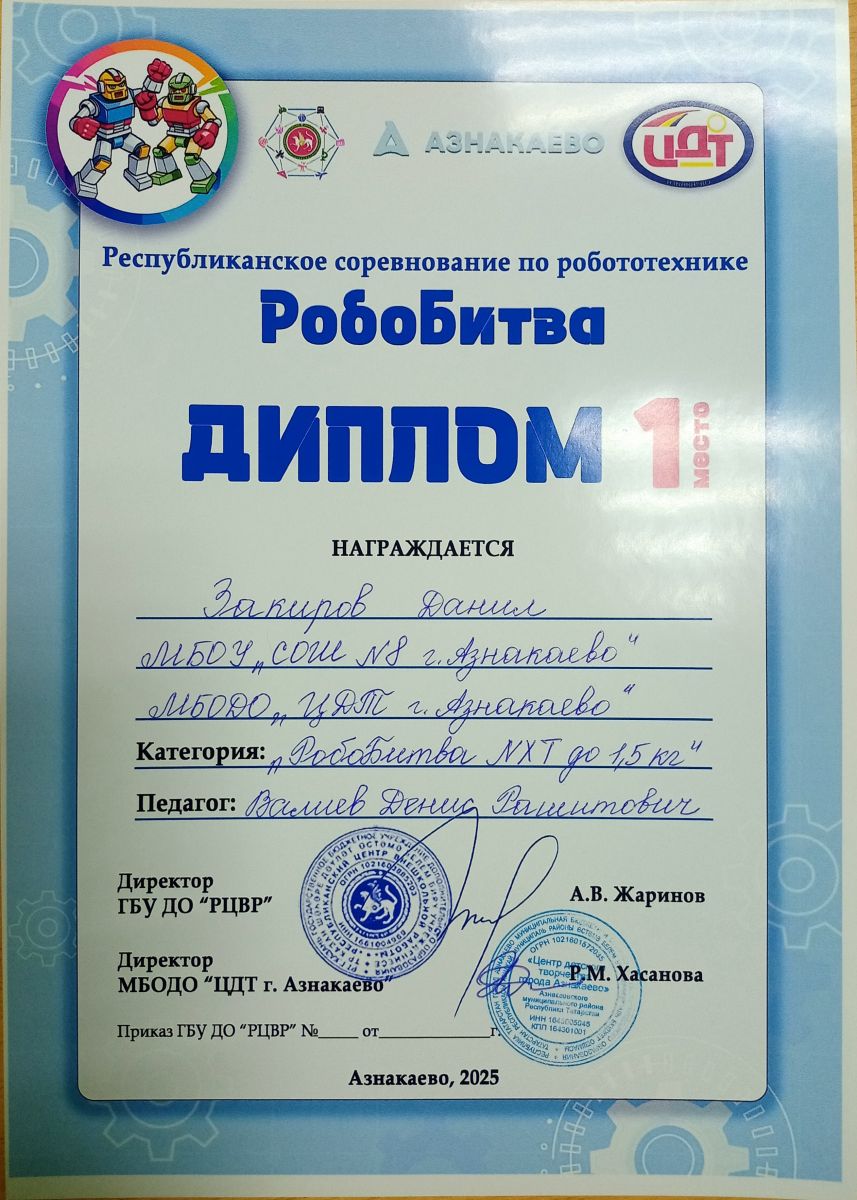 1 место в Республиканском соревновании по робототехнике "Робобитва" (Закиров Д., Валиев Д.)