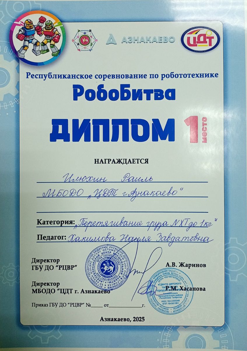 1 место в Республиканском соревновании по робототехнике "Робобитва" (Шайхутдинов Э., Хакимова Н.З.)