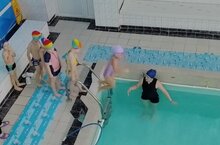 Воспитанники 3-го года обучения в группе педагога дополнительного образования Муртазиной М.М. на занятии готовились к предстоящим "Новогодним стартам": повторяли технику плавания кролем на груди, технику стартовых прыжков.