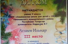 Ученик 4 класса Аглиев Ильнар (руководитель Харрасова Г.Ф.) занял 3 место на Республиканском конкурсе "Собака - символ 2018 года!" (г.Казань)