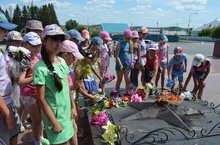 Многие дети в лагерь пришли со цветами . Было организовано возложение цветов к Вечному огню на Площади Победы. Затем дети знакомились со списками погибших земляков в ВОВ, находили фамилии и имена своих родственников на памятных стенах. Память о погибших почтили Минутой молчания. А с 12.30 до 13.00 наши четвероклассники достойно несли Вахту Памяти у Вечного огня.