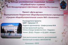Члены отряда профилактики «Гардиан» , ДШД «Лидер» и СД ДОО «Искра» МБОУ «СОШ№8 г.Азнакаево» приняли участие в муниципальном этапе республиканского конкурса реализованных социальных проектов «В добрый путь» в рамках XVIII Международного фестиваля «Детство без границ» с проектом «Дети-детям». 15.11.15 конкурсная работа была отправлена в Центр детского творчества.