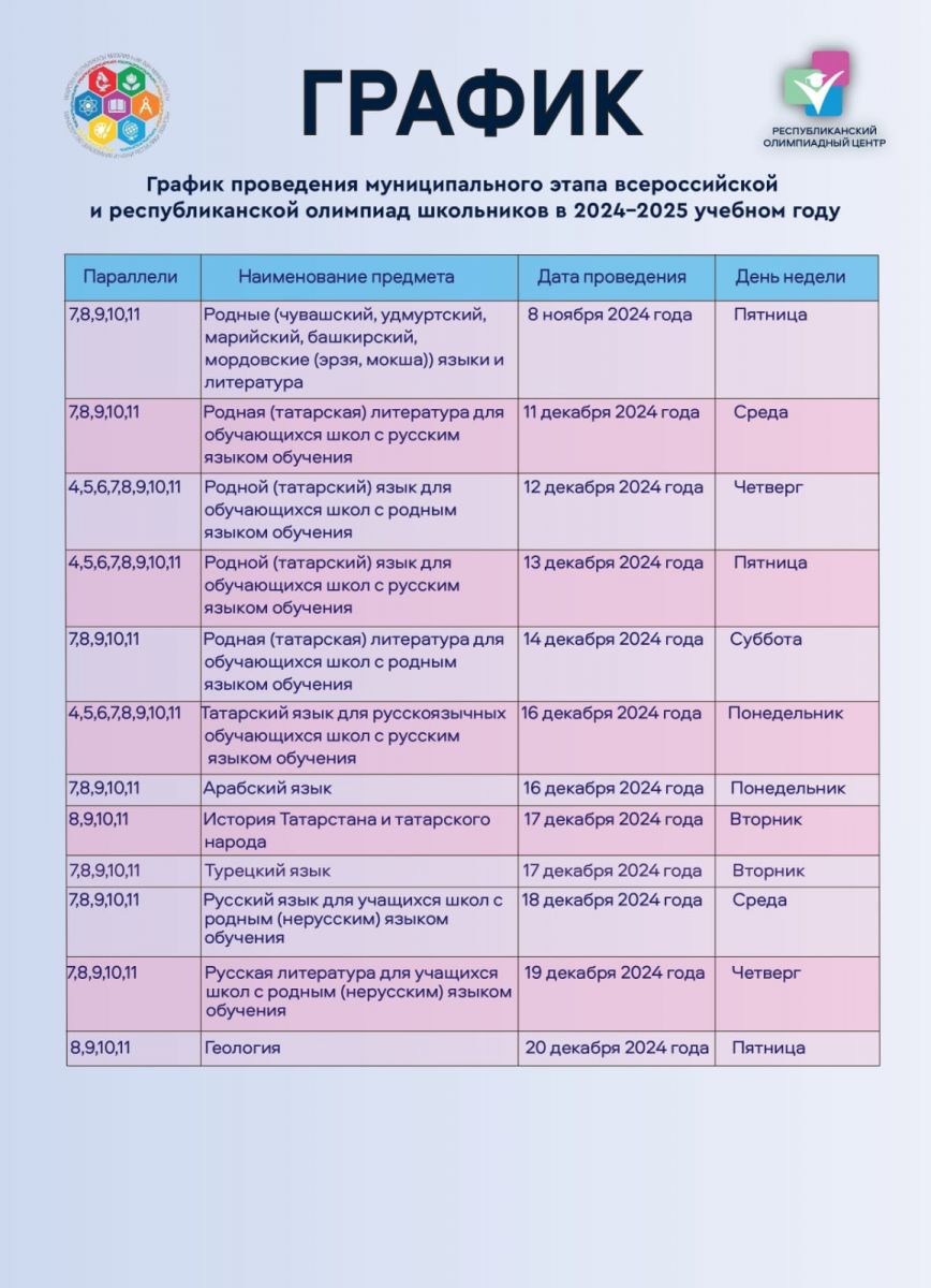 График проведения муниципального этапа всероссийской и республиканской олимпиад школьников в 2024-2025 учебном году 07.11.2024