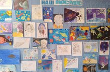 Членами совета дружины организована выставка рисунков учащихся "Наш космос", посвященная празднованию Дня космонавтики и 61-летия полёта в космос Ю. А. Гагарина.