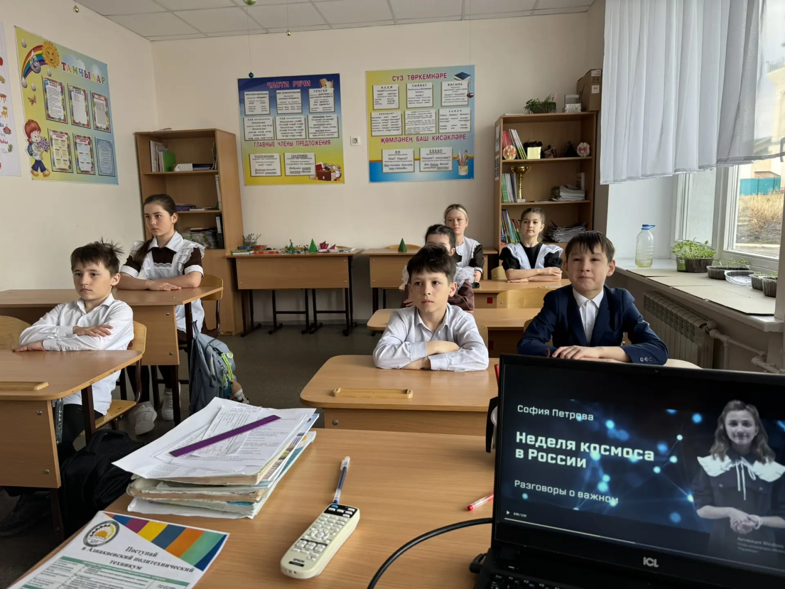Новая неделя и новая четверть начались с церемонии выноса и поднятия Государственных флагов Российской Федерации и Республики Татарстан. Это символ единства, уважения к нашей Родине и её богатой истории. «Разговоры о важном». Сегодняшний урок «Разговоры о важном» был посвящен удивительной дате — 65-летию триумфа отечественной космонавтики в преддверии Дня космонавтики. Ребята вспомнили великие достижения нашей страны и людей, которые открыли дорогу к звездам. Общешкольная линейка где: Озвучили план мероприятий на эту учебную неделю. Отметили успехи учеников! Прозвучали имена тех, кто отличился в учебе, спорте и творчестве на прошлой неделе. Поздравляем всех награжденных и желаем не останавливаться на достигнутом! Четверть — короткая, но очень важная. Впереди много работы, ярких событий и побед. Всем удачи и продуктивной недели!Бүген безнең мәктәптә укуның соңгы чиреге башланды. Дүшәмбе гадәттәгечә бай һәм тантаналы булды. РФ һәм ТР флагларын күтәрү.