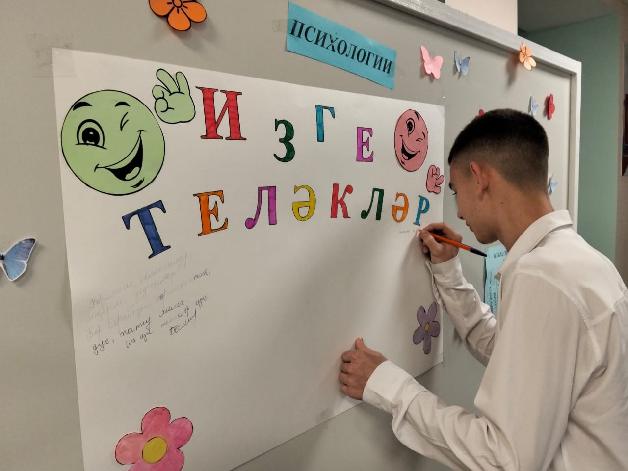 На этой неделе в школе проходит неделя психологии. Медиа-центр школы сделали плакат «Изге теләкләр», который повесили в фойе школы. Ребята подходили и писали пожелания своим друзьям и дорогим учителям. Когда ты что-то желаешь другому, то оно приходит не только к нему, но и к тебе! Акция "Изге теләкләр" позволила создать благоприятный климат в школе и поднять настроение нашим ученикам, поделится своей улыбкой и добром. Ребята нашей школе с большим интересом, энтузиазмом и желанием писали свои пожелания. Акция никого не оставила равнодушным! Давайте сделаем ее традиционный, ведь добро, подаренное другу, вернется к тебе многократно.