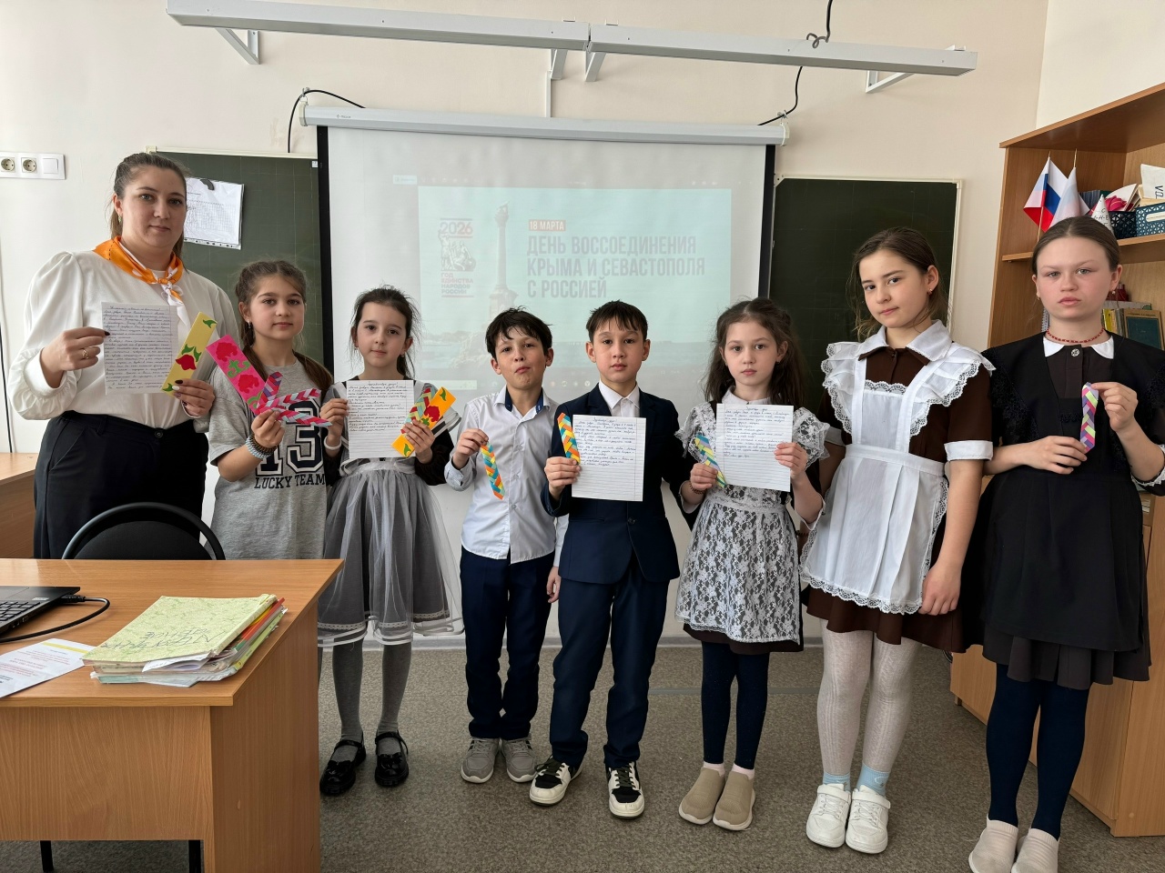 В этом году наша страна отмечает особенную дату – 12-ю годовщину воссоединения Крыма с Россией, важного события в новейшей истории. В честь этого события, Советник директора по воспитанию совместно с учениками 4 класса провели замечательную акцию. Ребята с энтузиазмом писали письма своим сверстникам из Крыма и создавали уникальные книжные закладки. Особое внимание было уделено дизайну закладок: в них гармонично сочетаются элементы татарского и крымско-татарского орнаментов, отражая богатство культурного наследия. Каждый ученик изготовил свою закладку, которая теперь отправится в конверте вместе с письмом, чтобы порадовать ребят из Крыма.