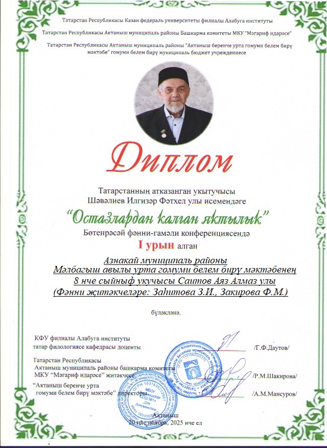 Участвуя в конференции имени Ильгиза Фатхулловича Шавалиева, Аглямова Иллария, Кадырова Лейсан, Саитов Аяз заняли первые места. Руководители Фарида Маратовна, Зинфера Ильясовна.