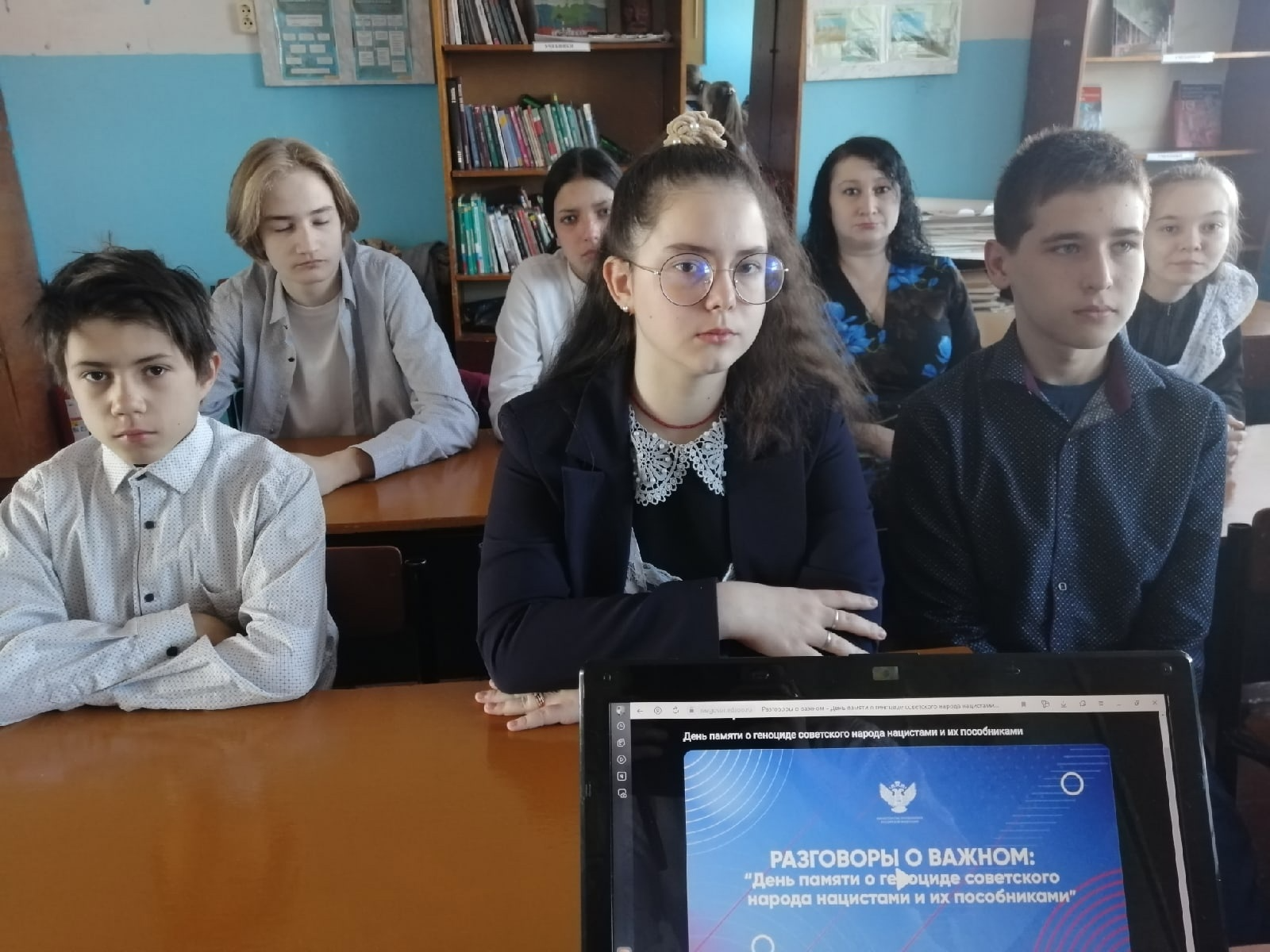 17.04.2023 занятия курса внеурочной деятельности "Разговоры о важном" в МБОУ «СОШ с.Мальбагуш» прошли на тему «День памяти о геноциде советского народа нацистами и их пособниками». Была раскрыта сущность понятия геноцид и определены причины возникновения геноцида. Обучающиеся узнали о роли и значении Дня единых действий, который проводится 19 апреля и объединяет людей в борьбе с любыми проявлениями нацизма и геноцида.