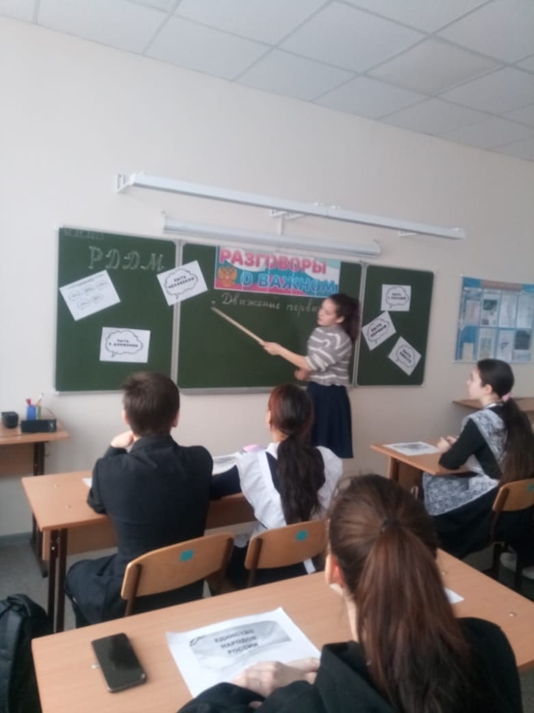 Классные руководители провели урок в 1-11 классах. Тема сегодняшнего занятия: "Российское движение детей и молодежи. Движение первых". Ребята узнали о деятельности Российского движения детей и молодежи" Движение первых ", побеседовали о том, что значит быть первым, просмотрели ролик о хронологии создания РДДМ. Также посмотрели обращение Григория Гурова, обсудили направления деятельности РДДМ.
