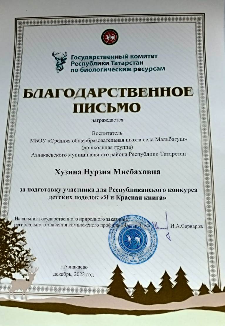 "Мин һәм Кызыл китап» балалар һөнәрләре конкурсының муниципаль этабы 2022 нче елның 5 нче октябреннән 25нче октябренә кадәр үткәрелде. Конкурста Мәлбагыш авылы балалар бакчасында тәрбияләнүчеләр актив катнашты. Жюри әгъзалары тәкъдим иткән нәтиҗәләр буенча җиңүчеләр билгеләнде. Тәрбияче Хуҗина Нурзия Мисбах кызы " Мин һәм Кызыл китап» республика балалар кул эшләре конкурсында катнашучы әзерләгән өчен грамота белән бүләкләнде.