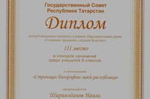 В рамках проекта «Правосудие: от А до Я» Управлением Судебного департамента в Республике Татарстан был проведен ежегодный конкурс сочинений, приуроченный ко Дню юриста среди учащихся 9-11 классов общеобразовательных организаций и 1-2 курсов техникумов Республики Татарстан. В конкурсе принял участие Аюпов Артем ученик 9б класса.