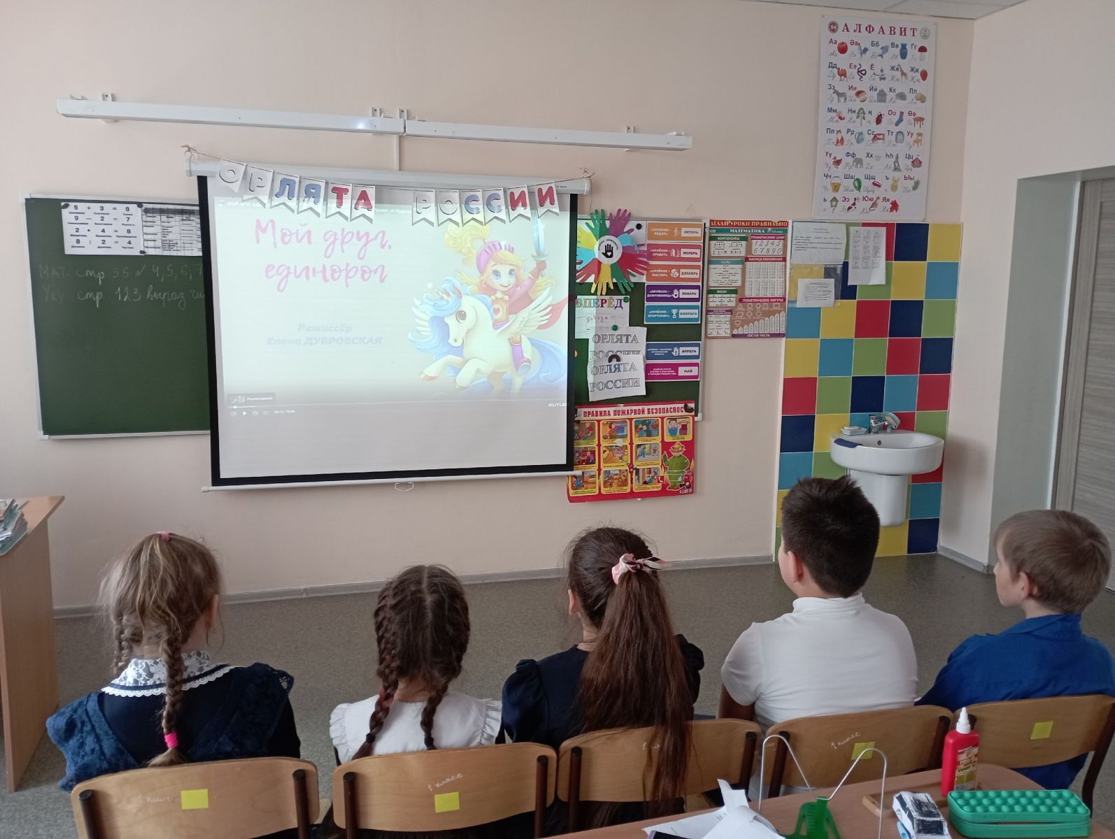 В начальных классах состоялся просмотр фильма «Мой друг единорог», который был предложен в рамках Всероссийского проекта «Киноуроки в школах России». Учащиеся ознакомились с понятиями «фантазия», «воображение», «сопереживание», «творчество», «умение дружить» на примере сюжета фильма. После просмотра фильма ребята обсудили поступки главных героев и приняли участие в обсуждении темы «воображение», поделились друг с другом своими мечтами, высказали свое мнение о существовании единорога.