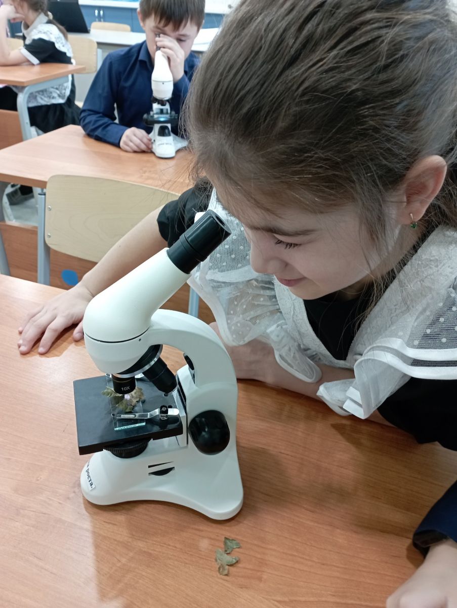 Безнең мәктәптә «Микроскоп белән танышу» дәресе узды. 2-4 нче класс укучылары микроскопның төзелешен өйрәнделәр. Галимнәр микроскопка карыйлар, тәҗрибәләр үткәрәләр. Аның эше күңелсез түгел-бөтенесе эштә, бөтенесе фәндә. Микроскоп-ул балага тылсымлы һәм серле микро дөньяга кагылырга мөмкинлек бирә торган фәнни прибор. Бу уенчык түгел. Бу кечкенә фәнни лаборатория, функциональлеге буенча чын биологик микроскоплардан калышмый. Микроскоп белән мавыктыргыч дәрес балаларга төрле объектларның структурасын өйрәнергә мөмкинлек бирә. Балалар үсемлек үрнәге төшерелгән лаборатория пыялаларын карадылар.