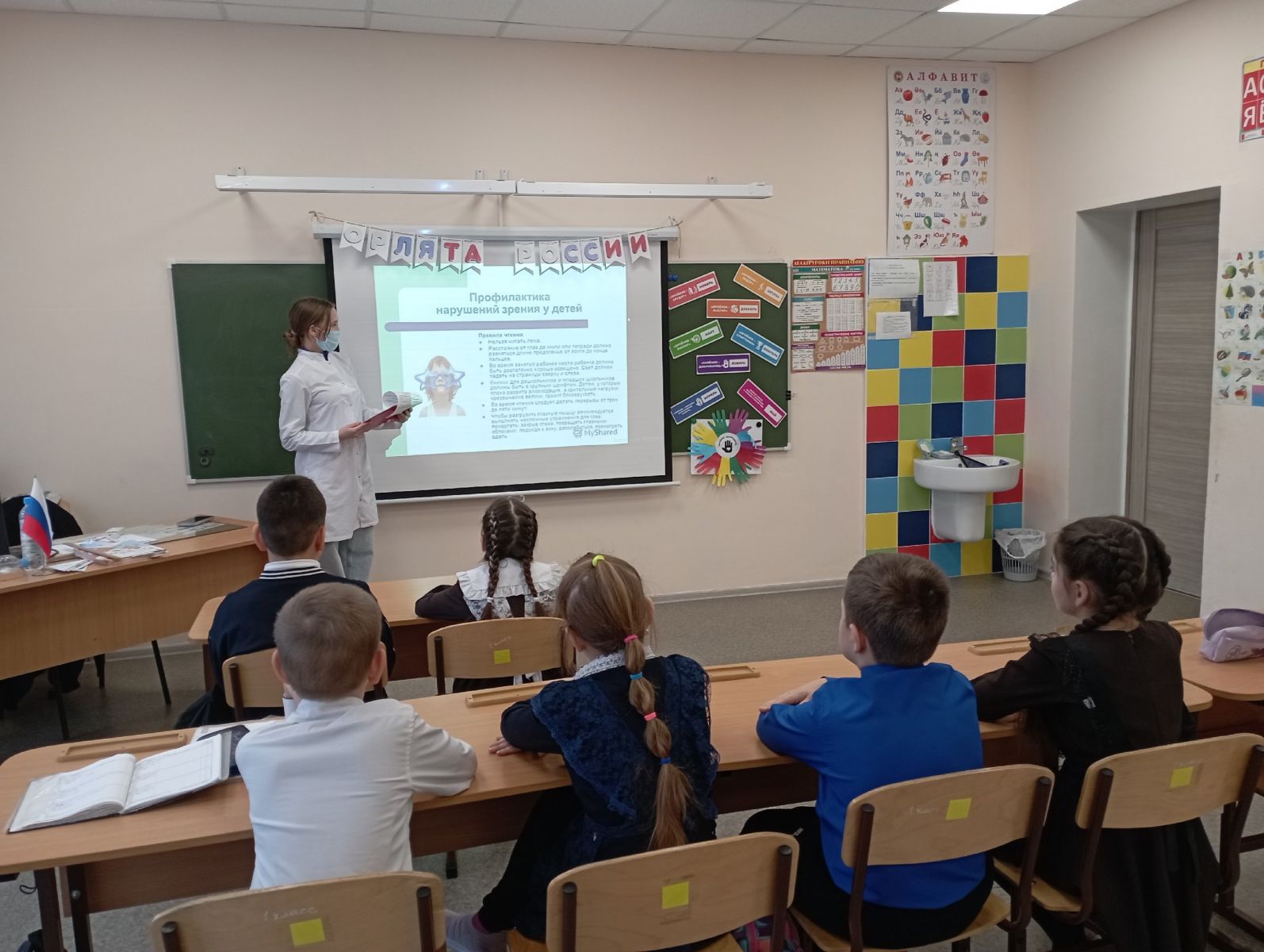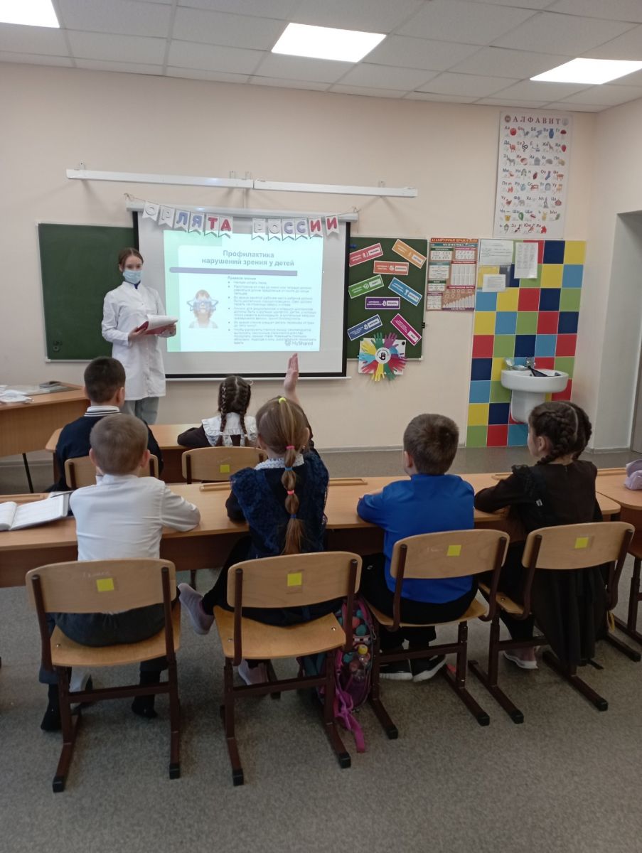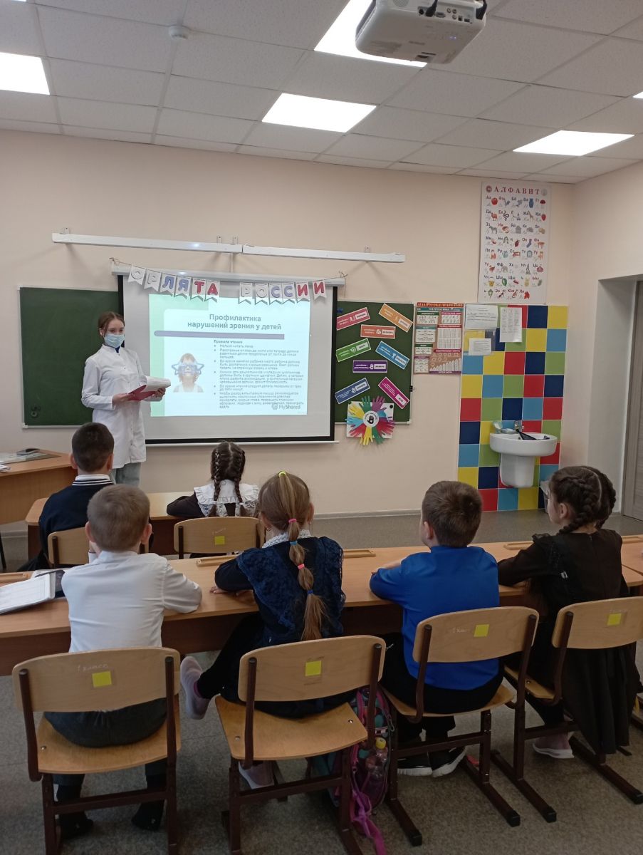 Фельдшер Әхмәтшина Р.К. 1-6 сыйныф укучылары белән «Балаларда күрү органнары авыруларын профилактикалау» темасына профилактик әңгәмә үткәрде.