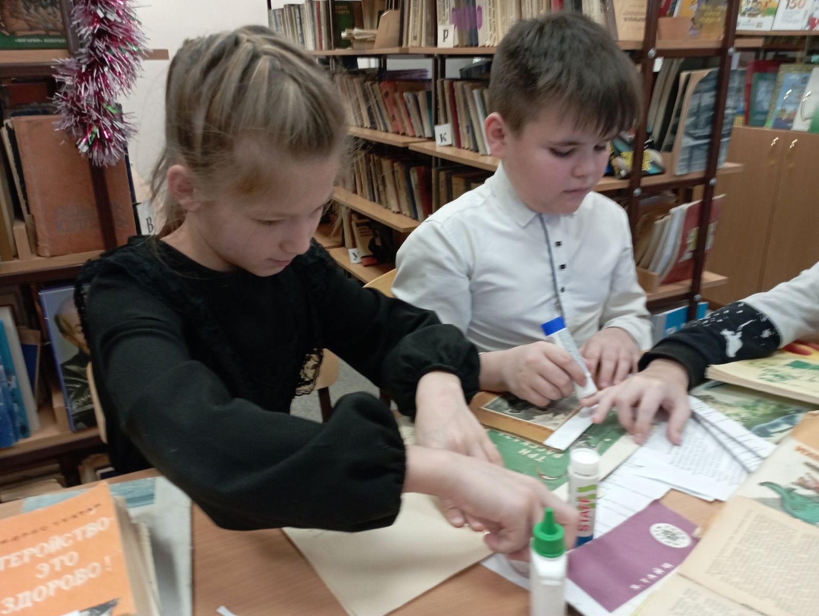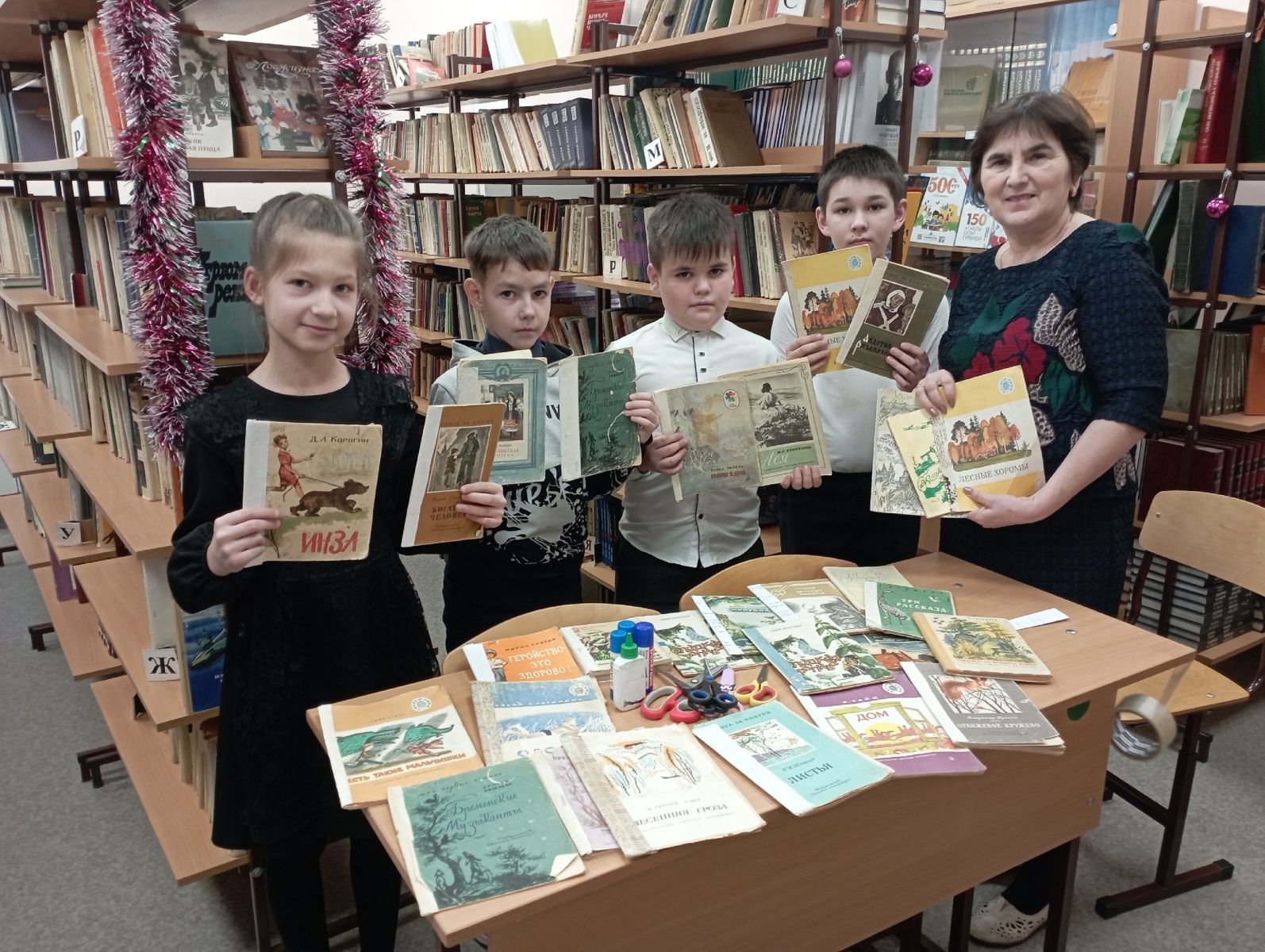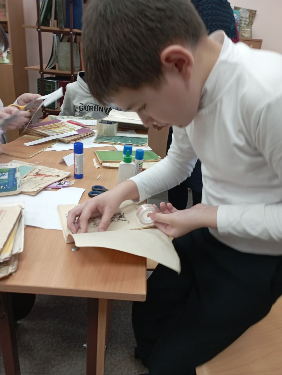 Библиотекарь Закиева Л.А. рассказала детям о том, как важно беречь книги и обучила навыкам простого ремонта книг. Затем ребята, из волонтёрского отряда "Забота" самостоятельно отбирали книги, требующие ремонта. Старательно резали картон и бумагу, клеили, замеряли заготовки, расправляли загнувшиеся страницы, стирали ластиком карандашные пометки, подклеивали страницы клеем и корешки бумагой.