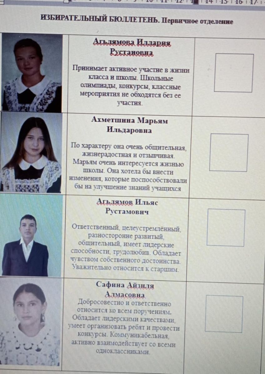 30 сентября 2025 года в первичном отделении Движение первых состоялись выборы Председателя Совета Первых первичного отделения Общероссийского общественно-государственного движения детей и молодежи «Движение Первых». Кандидаты, соответствующие строгим критериям (активность, лидерские качества и опыт организаторской деятельности) были представлены Совету обучающихся школы. Кандидаты презентовали свои портфолио, отвечали на вопросы. Проявили свои лидерские качества и смекалку. В ходе голосования на должность Председателя Совета Первых была избрана, ученица 9 класса Ахметшина Марьям Ильдаровна, заместителем Председателя –Агьлямова Иллария Рустамовна, ученица 10 класса. Поздравляем всю команду Совета Первых с избранием! Желаем им неиссякаемой энергии, креативных идей и ярких высот! Впереди – много интересного!