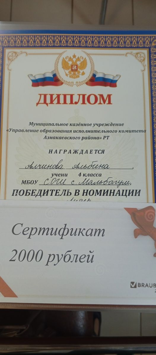 2025 елның 6 маенда Азнакайда "Башлангыч мәктәпнең иң яхшы укучысы" муниципаль конкурсы тәмамланды. Ул төбәк яшьләре өчен интеллект һәм иҗат бәйрәменә әверелде. Жюри аерым катнашучыларның сәләтләрен һәм уңышларын билгеләп үтте, махсус номинацияләр бирде: "Конкурс лидеры": Алчинова Альбина (җитәкчесе Заһитова Л.А.) конкурсны оештыручылар, җиңүчеләрне һәм призерларны котлап, укуларында һәм тормышында яңа уңышларга ирешеп, балаларның ирешкәннәрендә тукталып калмаячагына һәм белемнәрен һәм талантларын камилләштерүләрен дәвам итәчәгенә ышаныч белдерделәр.