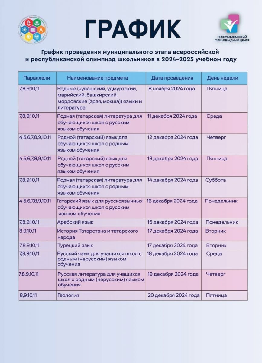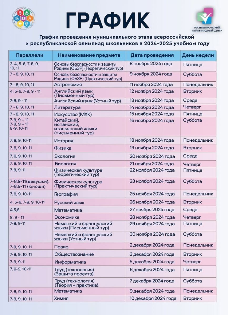 График проведения муниципального этапа всероссийской и республиканской олимпиад школьников 08.11.2024