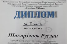 Ученик 9 класса Шакирзянов Руслан принял участие региональном этапе Всероссийской конференции "Юные техники и изобретатели в Государственной Думе Федерального собрания РФ "Ежегодная республиканская олимпиада юных изобретателей" "Кулибины XXI века" и занял 2 место. Руководитель: Шайдуллин Р.Р. Поздравляем!!!