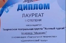 «Хыялый тургай» иҗат төркеме «Морозко» номеры өчен «Театр иҗаты», «Драма театры» номинацияләрендә II дәрәҗә диплом белән бүләкләнде. 2нче Б сыйныфы һәм аларның җитәкчеләре А.И.Хәкимҗанованы, А.Г.Нигъмәтҗанованы котлыйбыз. Афәрин!
