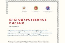 МБОУ «Балтасинская гимназия» награждена благодарственном письмом за активное участие в Республиканском антинаркотическом марафоне «Живу ЗдОрово!» и личный вклад в развитие Республиканского антинаркотического проекта «Самостоятельные дети». Руководитель отряда «СМС-дети»: Шарипова Р.Р.