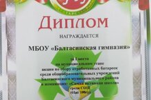 Балтач муниципаль районы гомуми белем бирү учреждениеләре арасында файдаланылган батарейкаларны җыю акциясенең муниципаль этабында урта гомуми белем бирү мәктәпләре арасында Балтач гимназиясе «Иң актив мәктәп» номинациясендә 1нче урынны алды. (61 кг.100г.). Котлыйбыз!