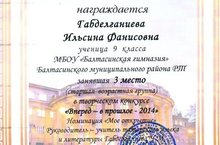 3 мартта КНИТУ да узган Бөтенроссия иҗади эшләр бәйгесендә катнашып, 9нчы А сыйныфы укучысы Габделганиева Илсинә 3нче урын яулады. Алга таба да уңышлар сиңа.