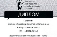 С 24 по 30 января 2015 года в ДОКЛ "Байтик" проходил очередной этап Республиканского проекта "IT-Jump". Учащиеся ИТ-класса Музипов Булат, Галимов Фаниль, Идрисов Булат, Ибрагимов Адель заняли первое место среди 15 команд. Руководитель: Мукминов М.Н.. Поздравляем!!!