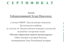 10а сыйныфы укучысы Габдрахманова Зөһрә, “Россия тарихында минем якташларым” дип исемләнгән Бөтенроссия сочинениеләр конкурсында катнашып, сертификат белән бүләкләнде. Аңа киләчәктә дә уңышлар телибез.
