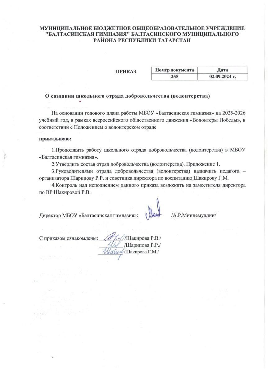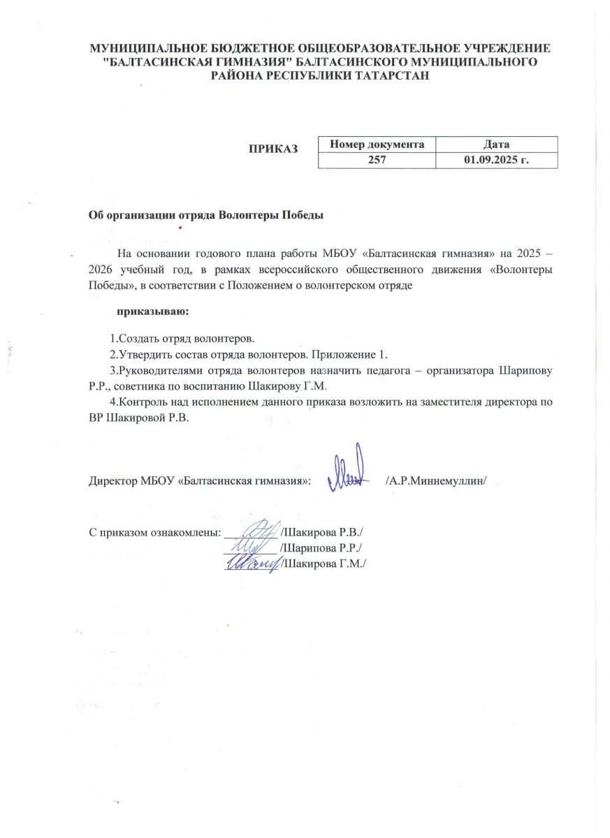 Приказ отряда "Волонтеры Победы" на 2025-2026 учебный год