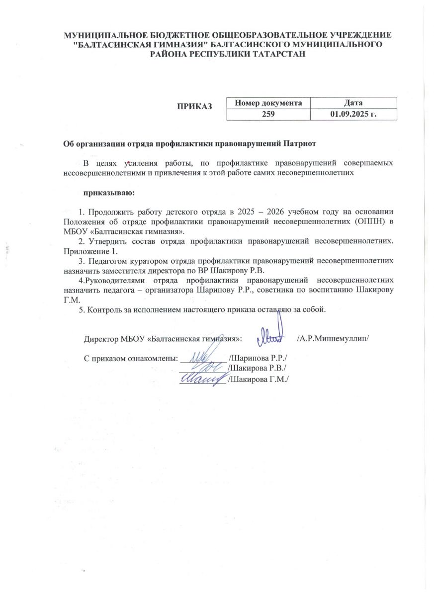 Приказ отряда профилактики правонарушений "Патриот" на 2025-2026 учебный год