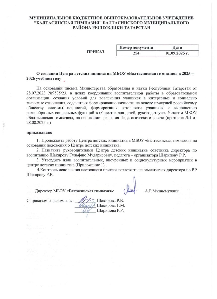 Приказ "О создании Центра детских инициатив" на 2025-2026 учебный год