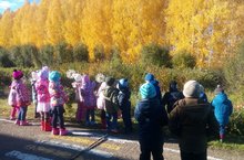 Бүген без каенлыкка экскурсиягә бардык. Каенлыкны ерактан күзәттек. Иң биек агач, куакны билгеләдек. Бакчада нинди куаклар үскәнен әйттек. Һәм яфраклар җыйдык. Ә ул яфраклардан мәйданчыкка кайткач, төрле бизәкләр төшереп уйнадык.