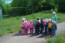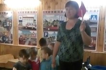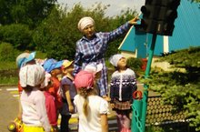Кечкенәләр төркеме тәрбиячесе Юсупова Р.М. балаларны юлда йөрү кагыйдәләре бнлән таныштыра.