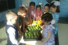 Иртәнге вакытта без табигать почмагында эшчәнлегебезне башлап җибәрдек: дежур тордык, гөлләрне, үсентеләрен тәрбияләдек, бакча гөлләренең исемнәрен кабатладык.