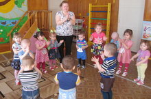 I кечкенәләр төркеме тәрбиячесе I кв. категорияле Зилә Әнәсовна балалар белән УМК маскалары ярдәмендә хәрәкәтле уеннар өйрәтә.